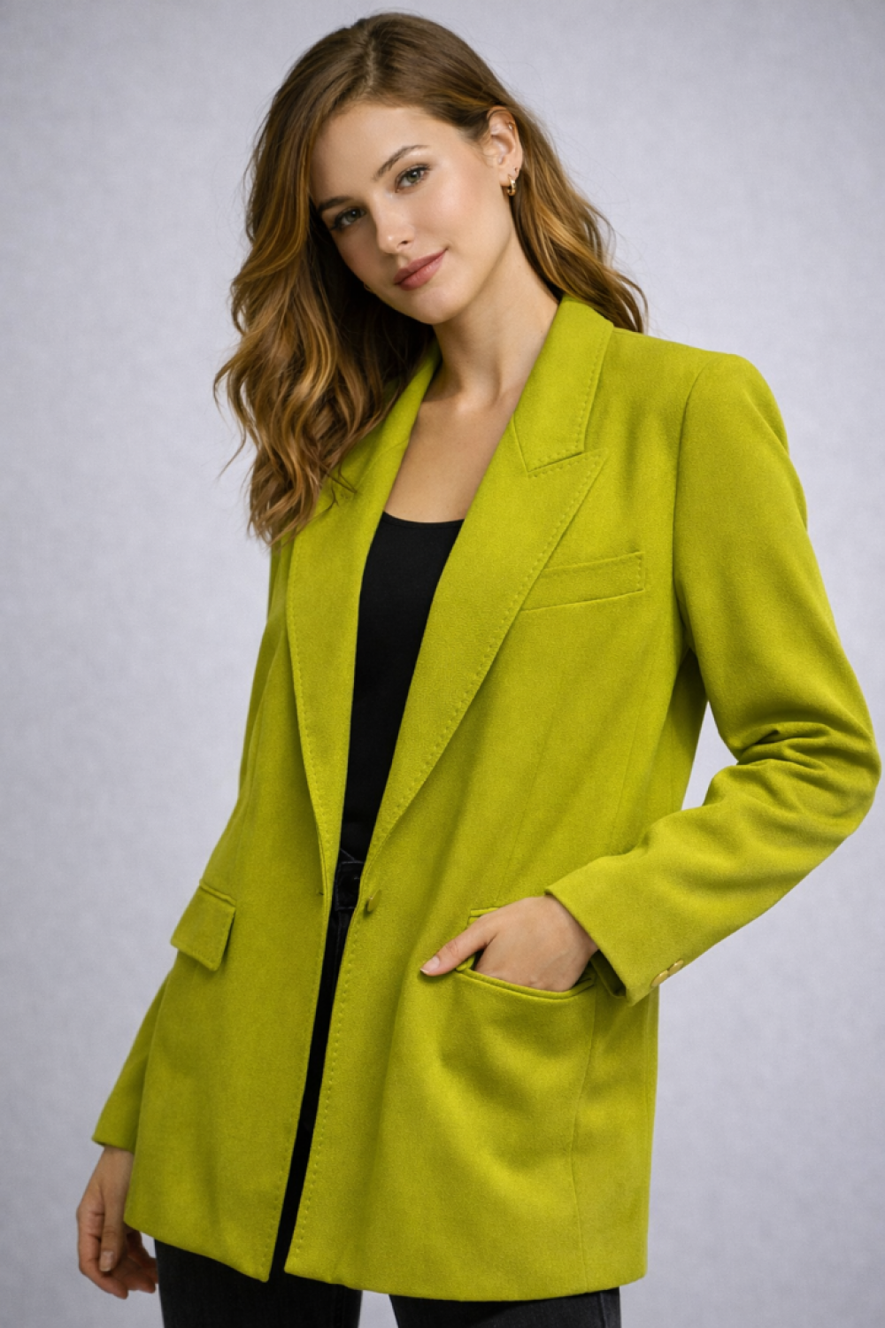 Stil sahibi kombinlerin tamamlayıcısı olan lime yeşili kadın blazer ceket, modern kesimi ve şık duruşuyla günlük ve ofis kombinlerine kolayca uyum sağlar. Tek düğmeli tasarımı sayesinde zarif bir siluet sunarken, cep detayları ceket görünümünü daha kullanışlı hale getirir. Klasik yaka formu ile hem casual hem de klasik tarzı sevenler için ideal bir seçimdir. Jean, kumaş pantolon veya etek kombinleriyle rahatlıkla kullanılabilir.