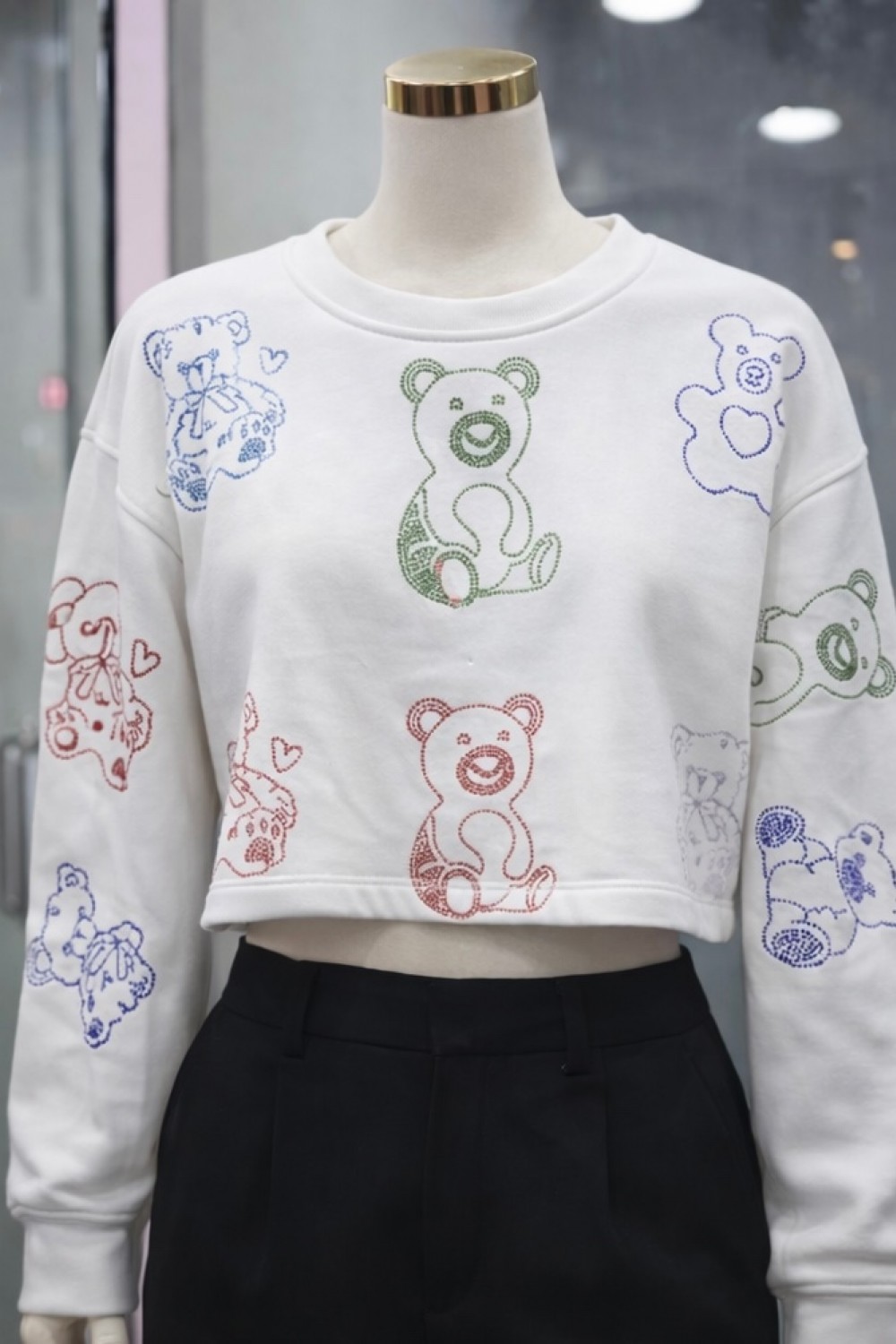 Rahat kesimli, kısa boy beyaz sweatshirt renkli ayıcık baskıları ve bisiklet yaka ile dikkat çeker. Yumuşak, örme kumaştan üretilmiştir.